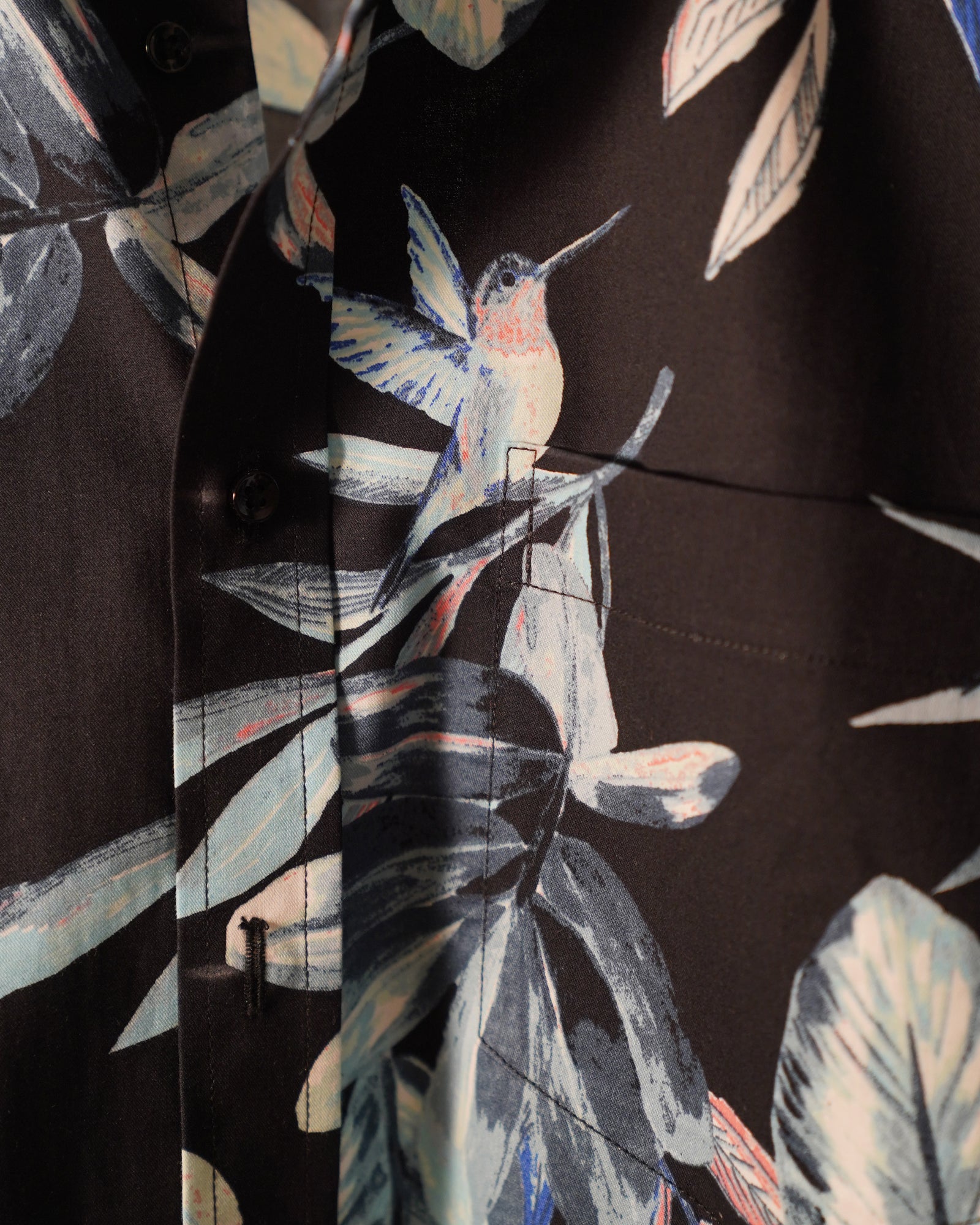 Black cotton shirt adorned with a striking tropical leaf print in shades of blue, grey, and subtle coral accents
